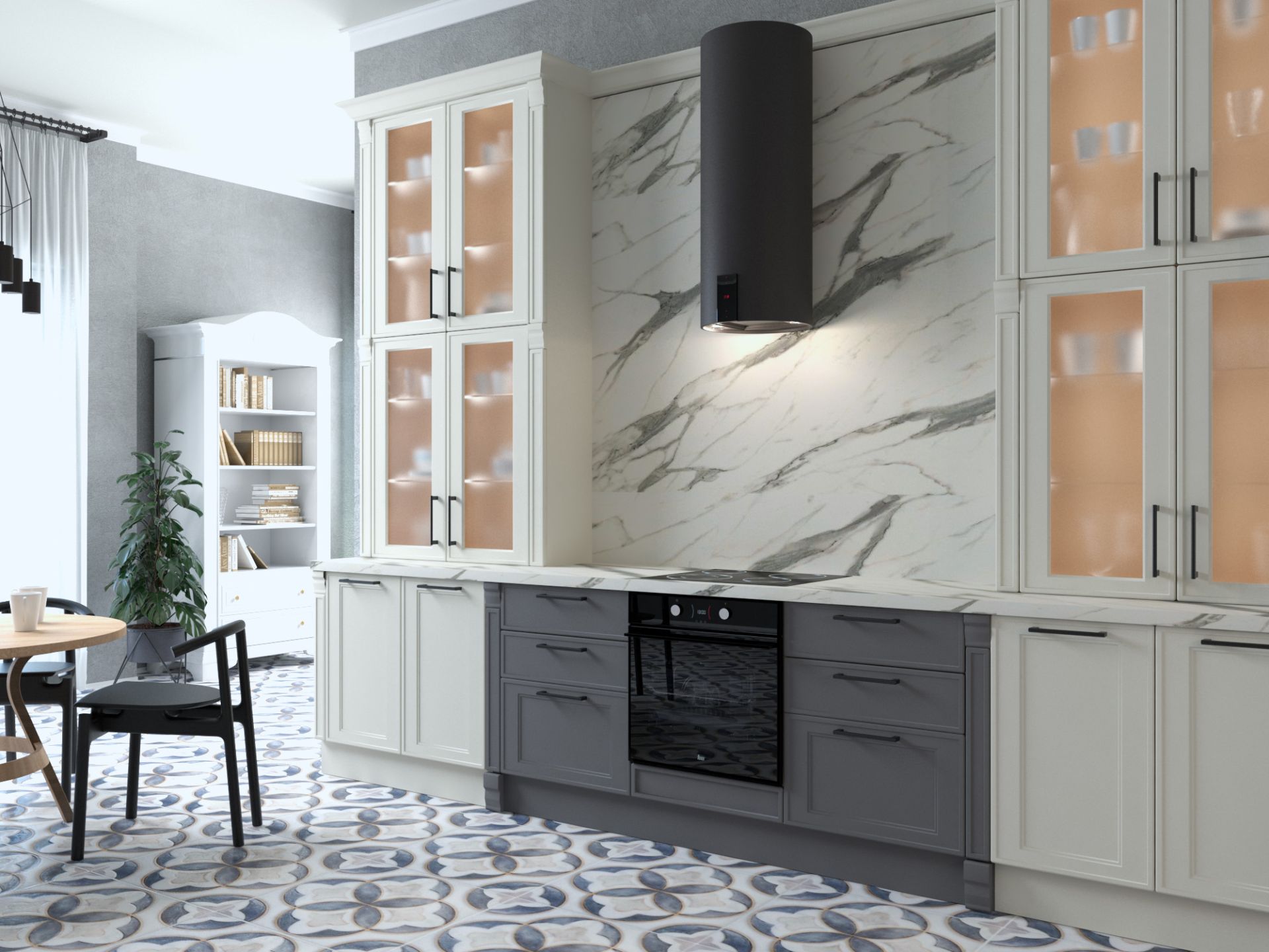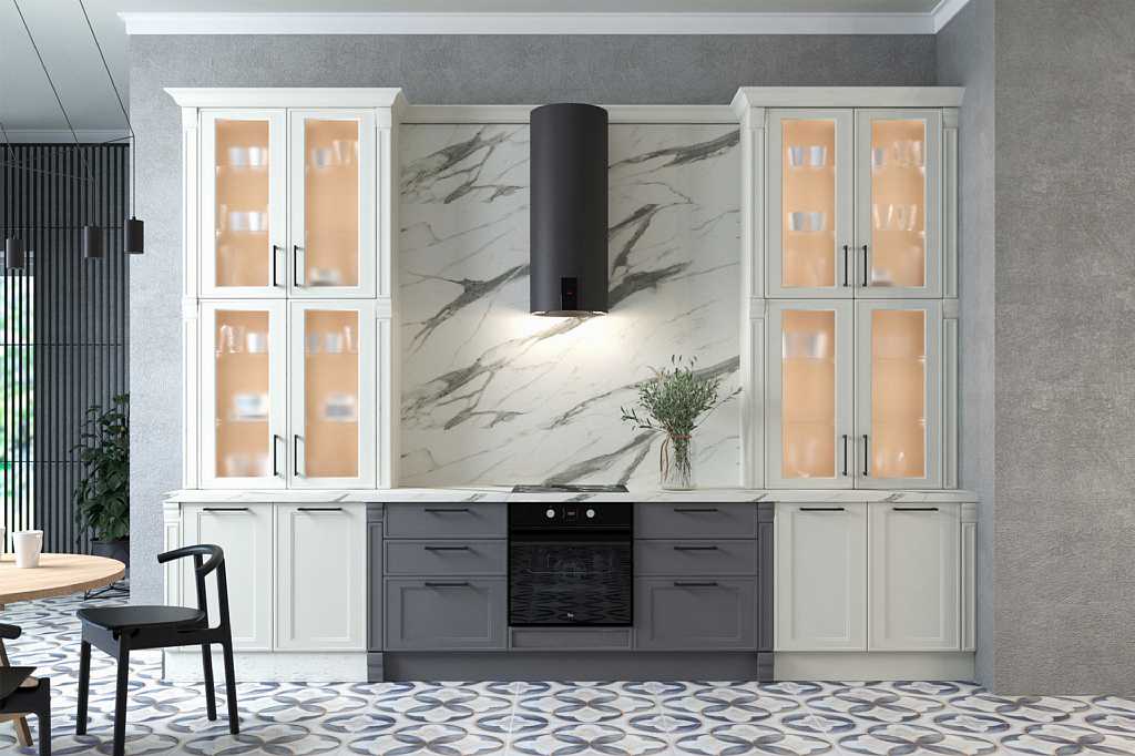 Элегантные фасады с двумя рамками подчеркивают красоту и индивидуальность модели. Витражи с матовым стеклом придают мебели легкости и лаконичности. Утонченная фурнитура — ручки-скобы, подчеркивающие рисунок рамок. Такая кухня идеально впишется в любой модный интерьер в современном стиле.